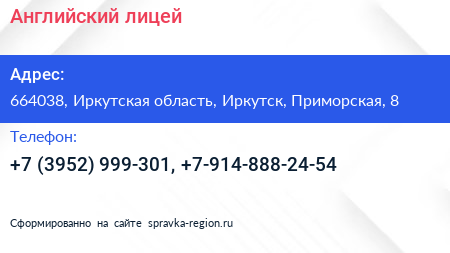Английский лицей по адресу 664038, Иркутская область, Иркутск, Приморская, 8 в дальнейшем Организация, размещена в следующих категориях: