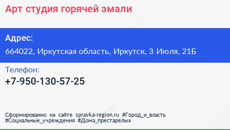 Арт-студия горячей эмали по адресу 664022, Иркутская область, Иркутск, 3 Июля, 21Б в дальнейшем Организация, размещена в следующих категориях: