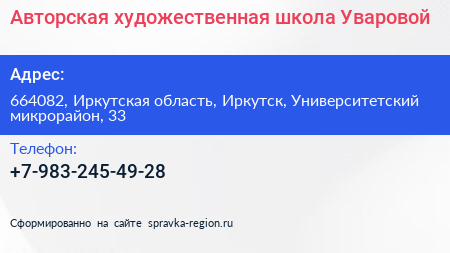 Авторская художественная школа Уваровой по адресу 664082, Иркутская область, Иркутск, Университетский микрорайон, 33 в дальнейшем Организация, размещена в следующих категориях: