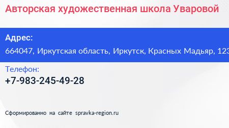 Авторская художественная школа Уваровой по адресу 664047, Иркутская область, Иркутск, Красных Мадьяр, 123 в дальнейшем Организация, размещена в следующих категориях: