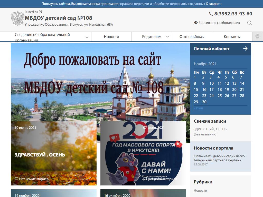 Детский сад №108, г. Иркутск по адресу 664019, Иркутская область, Иркутск, Напольная, 68а в дальнейшем Организация, размещена в следующих категориях: