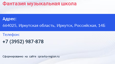 Фантазия, музыкальная школа по адресу 664025, Иркутская область, Иркутск, Российская, 14Б в дальнейшем Организация, размещена в следующих категориях: