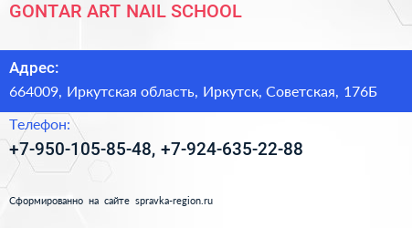 GONTAR ART NAIL SCHOOL по адресу 664009, Иркутская область, Иркутск, Советская, 176Б в дальнейшем Организация, размещена в следующих категориях:
