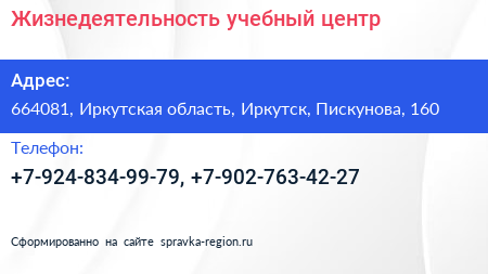 Жизнедеятельность, учебный центр по адресу 664081, Иркутская область, Иркутск, Пискунова, 160 в дальнейшем Организация, размещена в следующих категориях:
