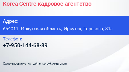 Korea Centre, кадровое агентство по адресу 664011, Иркутская область, Иркутск, Горького, 31а в дальнейшем Организация, размещена в следующих категориях: