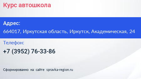Курс, автошкола по адресу 664017, Иркутская область, Иркутск, Академическая, 24 в дальнейшем Организация, размещена в следующих категориях: