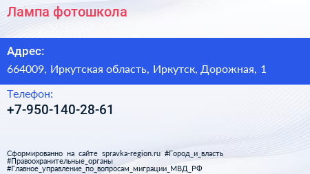 Лампа, фотошкола по адресу 664009, Иркутская область, Иркутск, Дорожная, 1 в дальнейшем Организация, размещена в следующих категориях: