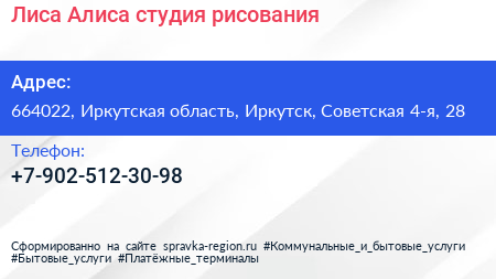 Лиса Алиса, студия рисования по адресу 664022, Иркутская область, Иркутск, Советская 4-я, 28 в дальнейшем Организация, размещена в следующих категориях: