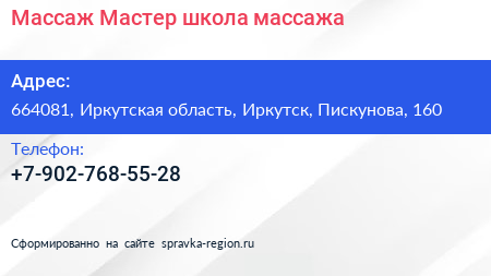 Массаж Мастер, школа массажа по адресу 664081, Иркутская область, Иркутск, Пискунова, 160 в дальнейшем Организация, размещена в следующих категориях: