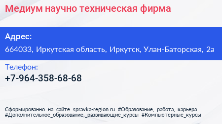 Медиум, научно-техническая фирма по адресу 664033, Иркутская область, Иркутск, Улан-Баторская, 2а в дальнейшем Организация, размещена в следующих категориях: