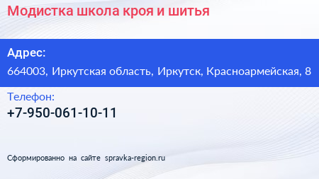 Модистка, школа кроя и шитья по адресу 664003, Иркутская область, Иркутск, Красноармейская, 8 в дальнейшем Организация, размещена в следующих категориях: