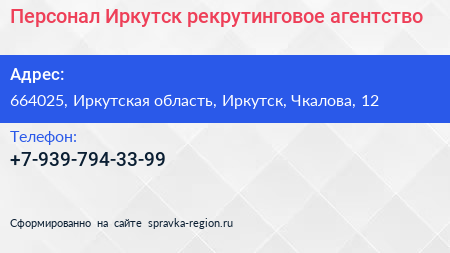 Персонал-Иркутск, рекрутинговое агентство по адресу 664025, Иркутская область, Иркутск, Чкалова, 12 в дальнейшем Организация, размещена в следующих категориях: