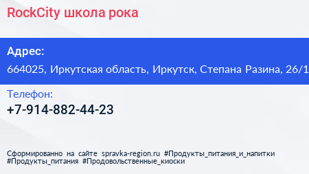 RockCity, школа рока по адресу 664025, Иркутская область, Иркутск, Степана Разина, 26/1 в дальнейшем Организация, размещена в следующих категориях: