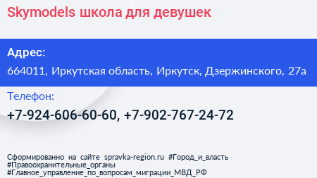 Skymodels, школа для девушек по адресу 664011, Иркутская область, Иркутск, Дзержинского, 27а в дальнейшем Организация, размещена в следующих категориях: