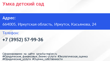 Умка, детский сад по адресу 664005, Иркутская область, Иркутск, Касьянова, 24 в дальнейшем Организация, размещена в следующих категориях: