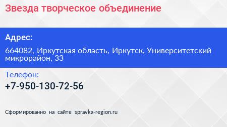 Звезда, творческое объединение по адресу 664082, Иркутская область, Иркутск, Университетский микрорайон, 33 в дальнейшем Организация, размещена в следующих категориях: