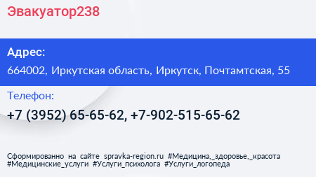 Эвакуатор238 по адресу 664002, Иркутская область, Иркутск, Почтамтская, 55 в дальнейшем Организация, размещена в следующих категориях: