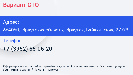 Вариант, СТО по адресу 664050, Иркутская область, Иркутск, Байкальская, 277/8 в дальнейшем Организация, размещена в следующих категориях: