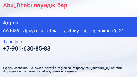 Abu_Dhabi, лаундж-бар по адресу 664039, Иркутская область, Иркутск, Терешковой, 21 в дальнейшем Организация, размещена в следующих категориях: