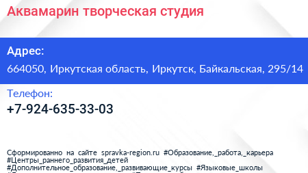 Аквамарин, творческая студия по адресу 664050, Иркутская область, Иркутск, Байкальская, 295/14 в дальнейшем Организация, размещена в следующих категориях: