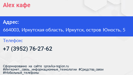 Alex, кафе по адресу 664003, Иркутская область, Иркутск, остров Юность, 5 в дальнейшем Организация, размещена в следующих категориях: