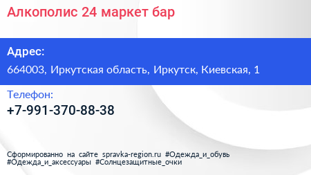Алкополис 24, маркет-бар по адресу 664003, Иркутская область, Иркутск, Киевская, 1 в дальнейшем Организация, размещена в следующих категориях:
