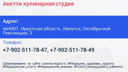 Анетти, кулинарная студия по адресу 664007, Иркутская область, Иркутск, Октябрьской Революции, 3 в дальнейшем Организация, размещена в следующих категориях: