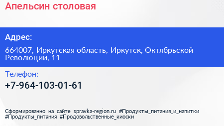 Апельсин, столовая по адресу 664007, Иркутская область, Иркутск, Октябрьской Революции, 11 в дальнейшем Организация, размещена в следующих категориях: