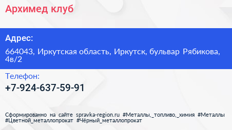 Архимед, клуб по адресу 664043, Иркутская область, Иркутск, бульвар Рябикова, 4в/2 в дальнейшем Организация, размещена в следующих категориях:
