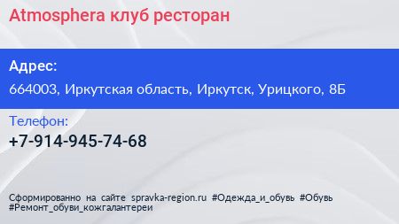 Atmosphera, клуб-ресторан по адресу 664003, Иркутская область, Иркутск, Урицкого, 8Б в дальнейшем Организация, размещена в следующих категориях: