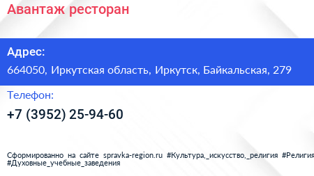 Авантаж, ресторан по адресу 664050, Иркутская область, Иркутск, Байкальская, 279 в дальнейшем Организация, размещена в следующих категориях: