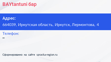 BAYtantuni, бар по адресу 664039, Иркутская область, Иркутск, Лермонтова, 4 в дальнейшем Организация, размещена в следующих категориях: