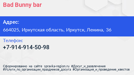 Bad Bunny bar по адресу 664025, Иркутская область, Иркутск, Ленина, 36 в дальнейшем Организация, размещена в следующих категориях: