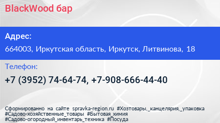 BlackWood, бар по адресу 664003, Иркутская область, Иркутск, Литвинова, 18 в дальнейшем Организация, размещена в следующих категориях: