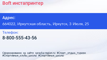 Boft, инстапринтер по адресу 664022, Иркутская область, Иркутск, 3 Июля, 25 в дальнейшем Организация, размещена в следующих категориях: