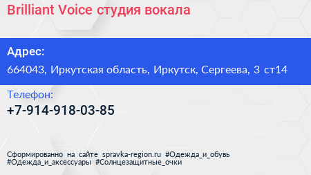 Brilliant Voice, cтудия вокала по адресу 664043, Иркутская область, Иркутск, Сергеева, 3 ст14 в дальнейшем Организация, размещена в следующих категориях: