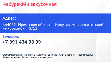 ЧебурекМи, закусочная по адресу 664082, Иркутская область, Иркутск, Университетский микрорайон, 43/11 в дальнейшем Организация, размещена в следующих категориях: