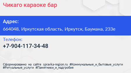 Чикаго, караоке-бар по адресу 664048, Иркутская область, Иркутск, Баумана, 233е в дальнейшем Организация, размещена в следующих категориях: