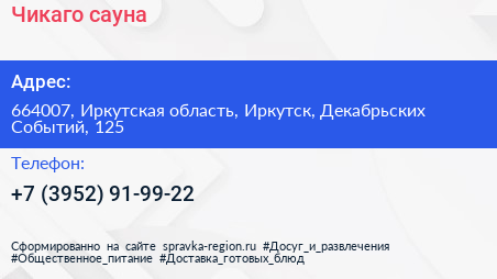 Чикаго, сауна по адресу 664007, Иркутская область, Иркутск, Декабрьских Событий, 125 в дальнейшем Организация, размещена в следующих категориях: