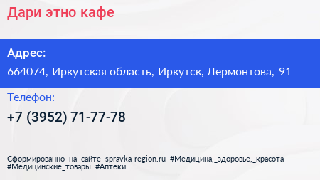 Дари, этно-кафе по адресу 664074, Иркутская область, Иркутск, Лермонтова, 91 в дальнейшем Организация, размещена в следующих категориях: