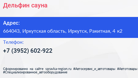 Дельфин, сауна по адресу 664043, Иркутская область, Иркутск, Ракитная, 4 к2 в дальнейшем Организация, размещена в следующих категориях: