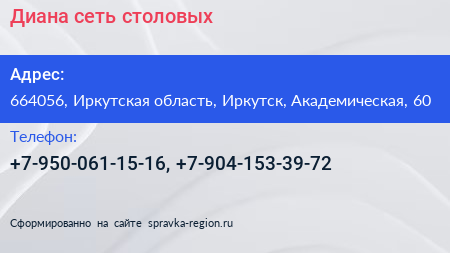 Диана, сеть столовых по адресу 664056, Иркутская область, Иркутск, Академическая, 60 в дальнейшем Организация, размещена в следующих категориях: