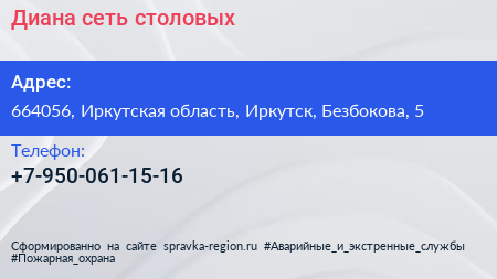 Диана, сеть столовых по адресу 664056, Иркутская область, Иркутск, Безбокова, 5 в дальнейшем Организация, размещена в следующих категориях: