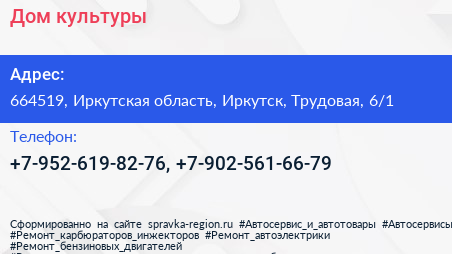 Дом культуры по адресу 664519, Иркутская область, Иркутск, Трудовая, 6/1 в дальнейшем Организация, размещена в следующих категориях: