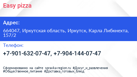 Easy pizza по адресу 664047, Иркутская область, Иркутск, Карла Либкнехта, 157/2 в дальнейшем Организация, размещена в следующих категориях: