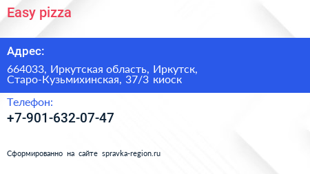 Easy pizza по адресу 664033, Иркутская область, Иркутск, Старо-Кузьмихинская, 37/3 киоск в дальнейшем Организация, размещена в следующих категориях: