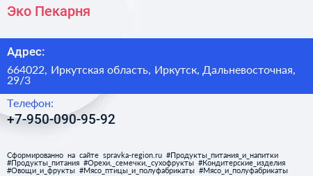 Эко Пекарня по адресу 664022, Иркутская область, Иркутск, Дальневосточная, 29/3 в дальнейшем Организация, размещена в следующих категориях: