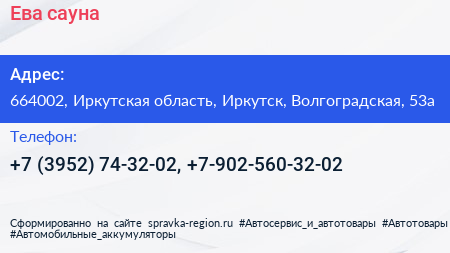 Ева, сауна по адресу 664002, Иркутская область, Иркутск, Волгоградская, 53а в дальнейшем Организация, размещена в следующих категориях: