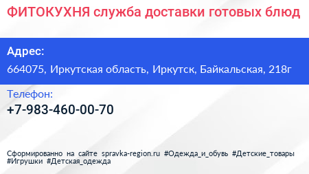 ФИТОКУХНЯ, служба доставки готовых блюд по адресу 664075, Иркутская область, Иркутск, Байкальская, 218г в дальнейшем Организация, размещена в следующих категориях:
