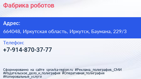 Фабрика роботов по адресу 664048, Иркутская область, Иркутск, Баумана, 229/3 в дальнейшем Организация, размещена в следующих категориях:
